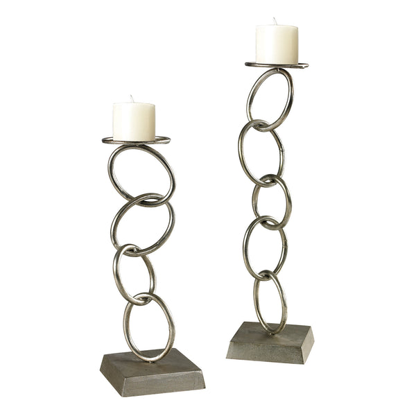 Elegant metal chains form this set of 2 Industrial Chic candle holders, each finished in a bright silver leaf.