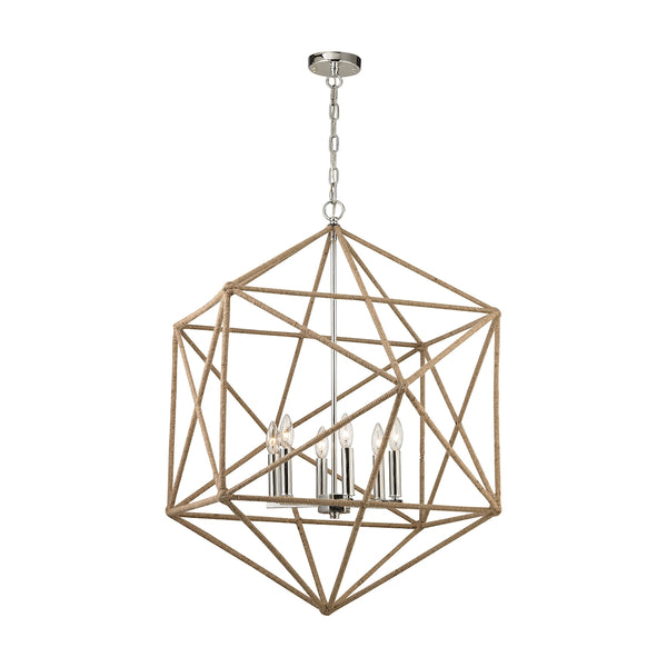 The Exitor pendant combines the rusticness of a rope wrapped frame with Polished Nickel hardware creating a warm and sophisticated geometric design.