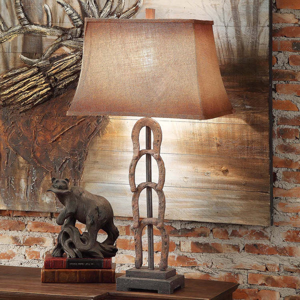 Horseshoe Table Lamp 34"Ht.,Metal&Resin Rustic Metal Finish 13.5/8 x 17/12 x 12 Antique Burlap Shade