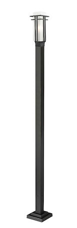 The geometric lines of the Abbey family combine well with contemporary home styling as well as homes in the craftsmen style. This medium outdoor post light fixture is made of steel and finished in black with matte opal glass