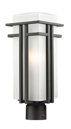 The geometric lines of the Abbey family combine well with contemporary home styling as well as homes in the craftsmen style. This large outdoor post head fixture is made of steel and finished in Dark Outdoor Rubbed Bronze with matte opal glass.