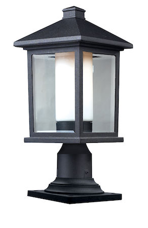This outdoor pier mount is unique because of its duel-layered construction that gives it a stylish, modern look. The outer glass shell is clear beveled glass, while the inner glass is a matte opal, which creates an inviting warm glow. To complete the look, this outdoor fixture is finished in black and is made of cast aluminum.
