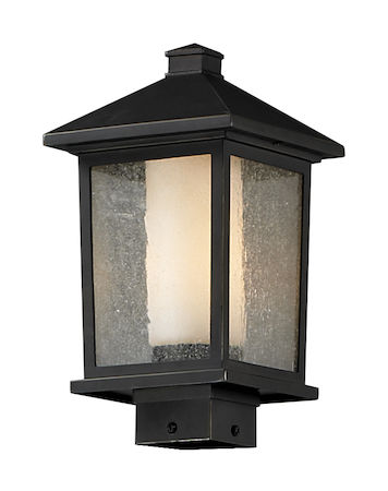 Unique double glass styling and rectangular detailing define the modern styling of this medium outdoor post head. Seedy glass on the outside with matte opal inner glass creates an elegant glow, while the cast aluminum hardware finished in oil rubbed bronze can withstand nature’s seasonal elements.