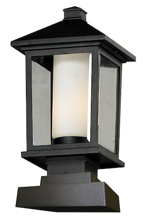 Unique double glass styling and rectangular detailing define the modern styling of this medium outdoor pier mount. Clear beveled glass on the outside with matte opal inner glass creates an elegant glow, while the cast aluminum hardware finished in black can withstand nature’s seasonal elements.