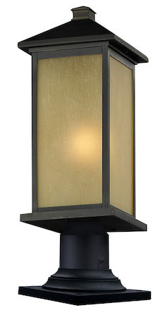 Clean, straight lines and rectangular detailing define the classic styling of this outdoor posthead light with pier mount. Tinted seedy glass panels create an elegant glow, while the cast aluminum hardware finished in oil rubbed bronze can withstand nature’s seasonal elements.