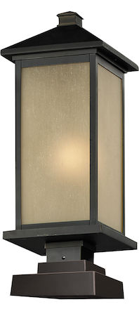 Clean, straight lines and rectangular detailing define the classic styling of this outdoor posthead light with pier mount. Tinted seedy glass panels create an elegant glow, while the cast aluminum hardware finished in oil rubbed bronze can withstand nature’s seasonal elements.