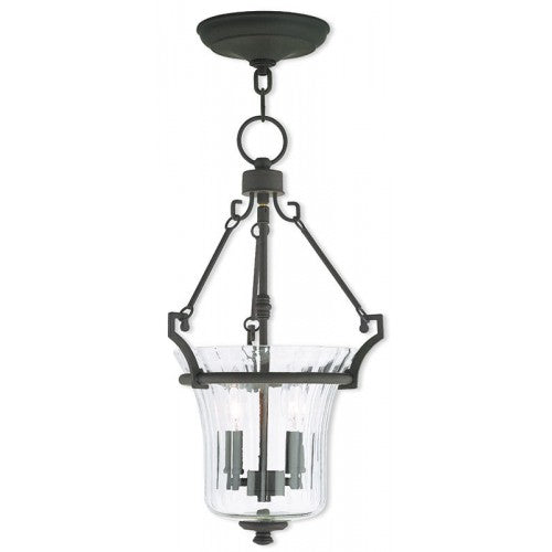This sophisticated chain hung lantern is perfect for your traditional or transitional style home decor. A decorative hand crafted fluted clear glass is suspended from a bronze canopy by three rod attachments.