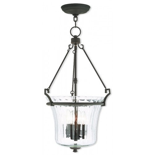This sophisticated chain hung latern is perfect for your traditional or trasitional style home decor. A decorative had crafted fluted clear glass is suspended from a bronze caopy by three rod attachments.