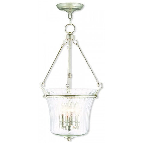 This sophisticated chain hung latern is perfect for your traditional or trasitional style home decor. A decorative had crafted fluted clear glass is suspended from a polished nickel caopy by three rod attachments.