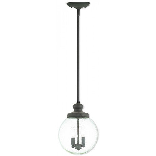 The classic shaped hand crafted clear seeded glass shade contrasts with and complements the bronze finish housing of this pendant design. Its understated charm will fit well with most room decor styles.