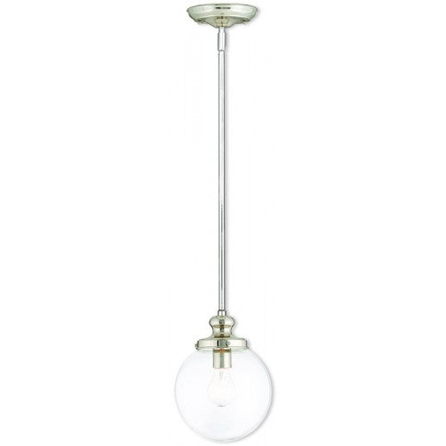 The classic shaped hand crafted clear glass shade contrasts with and complements the polished nickel finish housing of this mini pendant design. Its understated charm will fit well with most room decor styles.