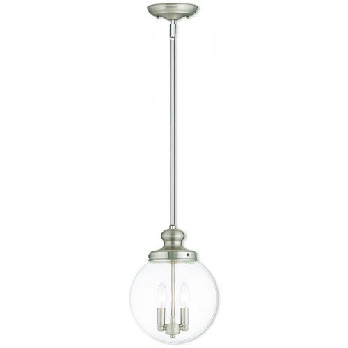 The classic shaped hand crafted clear glass shade contrasts with and complements the brushed nickel finish housing of this pendant design. Its understated charm will fit well with most room decor styles.