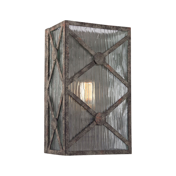 The Radley collection has a crosshatch-patterned frame finished in Malted Rust. Thick textured "raindrop" glass panels diffuse the light to form a warm glow.