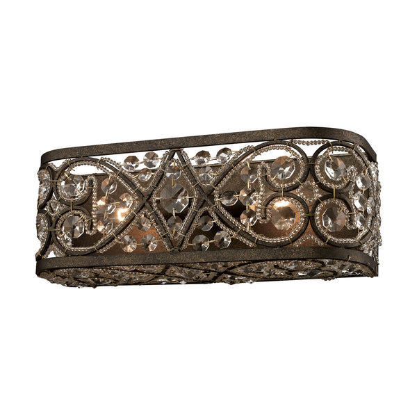 This collection showcases sparkling polished crystal weaved into an intricate wrought iron frame. The modern drum shape updates an otherwise traditional style while a rich, Antique Bronze finished frame provides the necessary contrast to allow the crystal