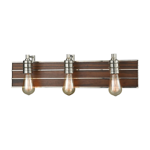 Brookweiler 3 Light Vanity In Polished Nickel With Dark Wood Backplate