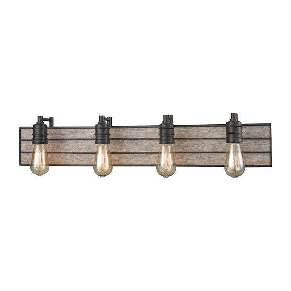 Brookweiler 4 Light Vanity In Oil Rubbed Bronze With Washed Wood Backplate
