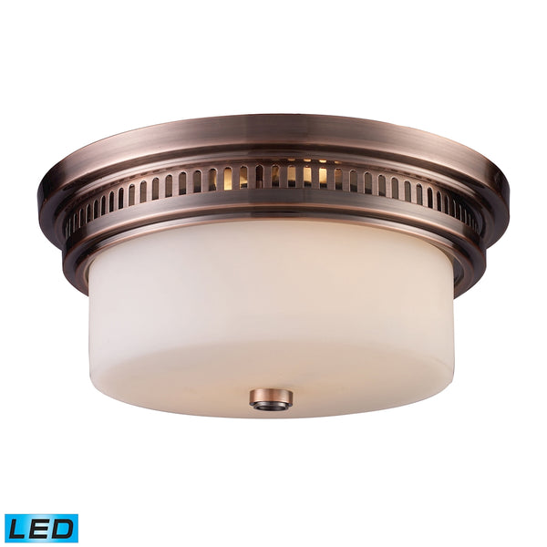 Chadwick 2 Light LED Flushmount In Antique Copper And White Glass