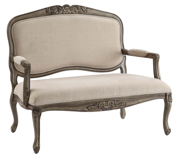 Etruscan Settee Etruscan Settee 49" x 27" x 40.5",Wood Upholstered Linen Settee with Antiqued Wood Carvings 49" x 27" x 40.5"