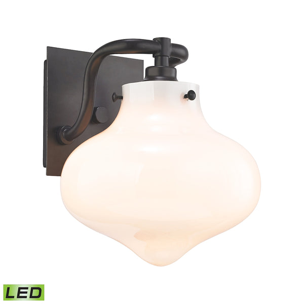 Oil Rubbed Bronze finish vanity with opal white glass. Includes replaceable LED bulb.