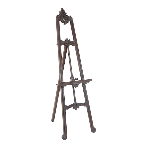 The dark rich stain and ample stature of our Chevalet Collection Solid Mahogany Easel is surpassed only by its gorgeous foliated crown, delectable Arabesque center niches, and graceful voluted feet. This fully adjustable, hand carved easel is reinforced by an elegant functioning armature that supports a sturdy working platform. Beautiful and stately, the Chevalet is obviously perfect for a canvas; but it is equally at home in a hall or gallery, next to a piano, or for photographic display.