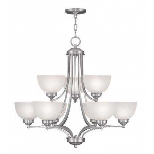 Smooth lines meet gorgeous materials in our Somerset collection. The sleek design will add contemporary class and appeal to your home. This nine light chandelier features a brushed nickel finish with satin glass.