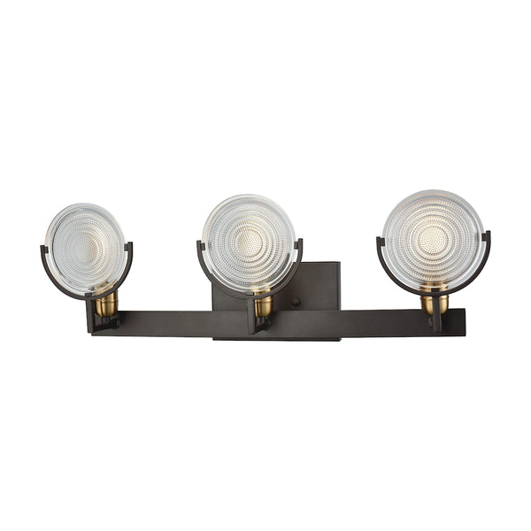 Ocular 3 Light Vanity In Oil Rubbed Bronze With Satin Brass Accents And Clear Railroad Light Glass