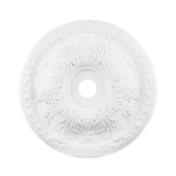 The Pennington Medallion offers a stately radiance of crowned acanthus accentuated with cusped vignettes and a elegant band of acorn cabochon. Perfect to enhance an ancestral theme or bring distinction to a brand new home. Choose soothing White or stylish Antique Bronze.