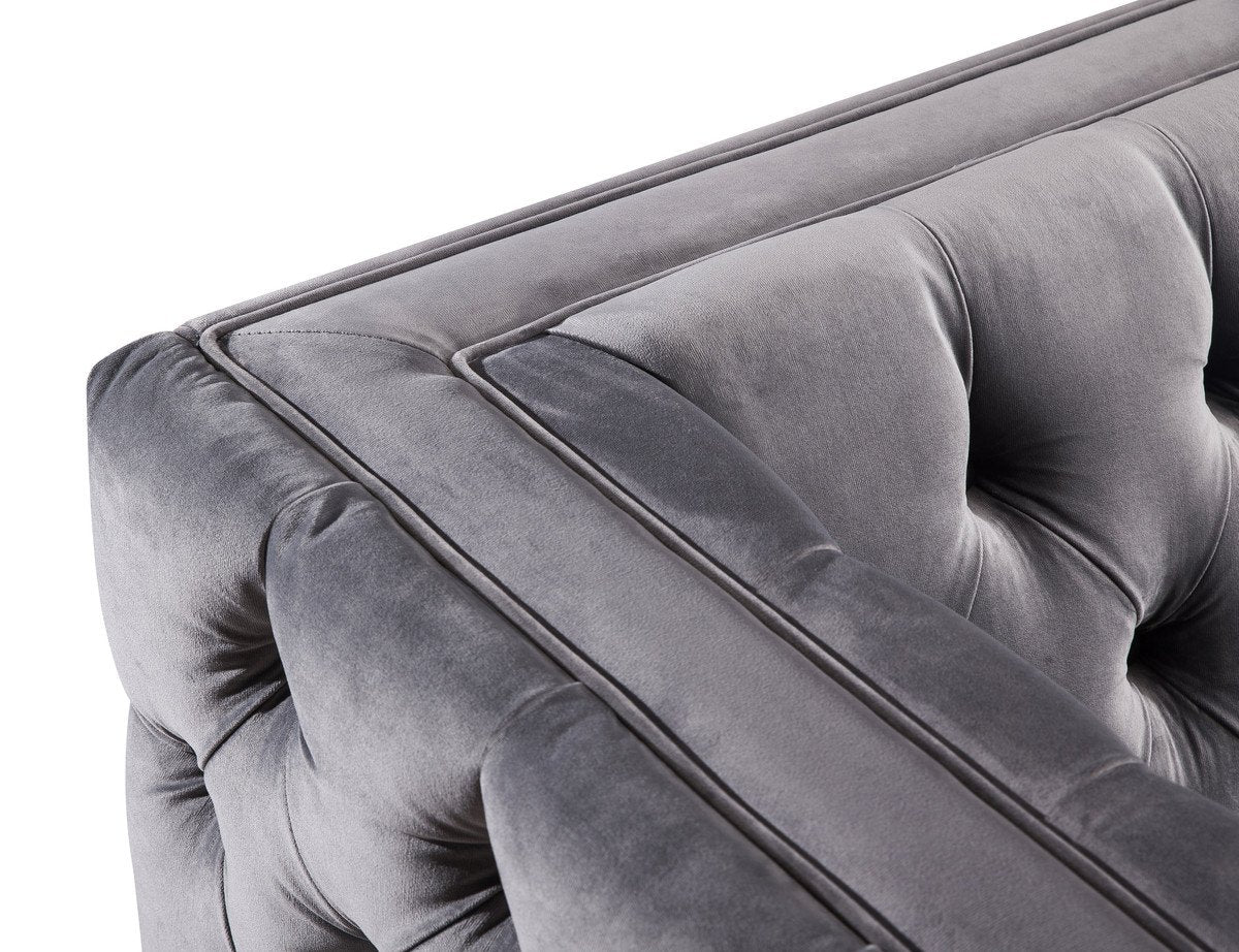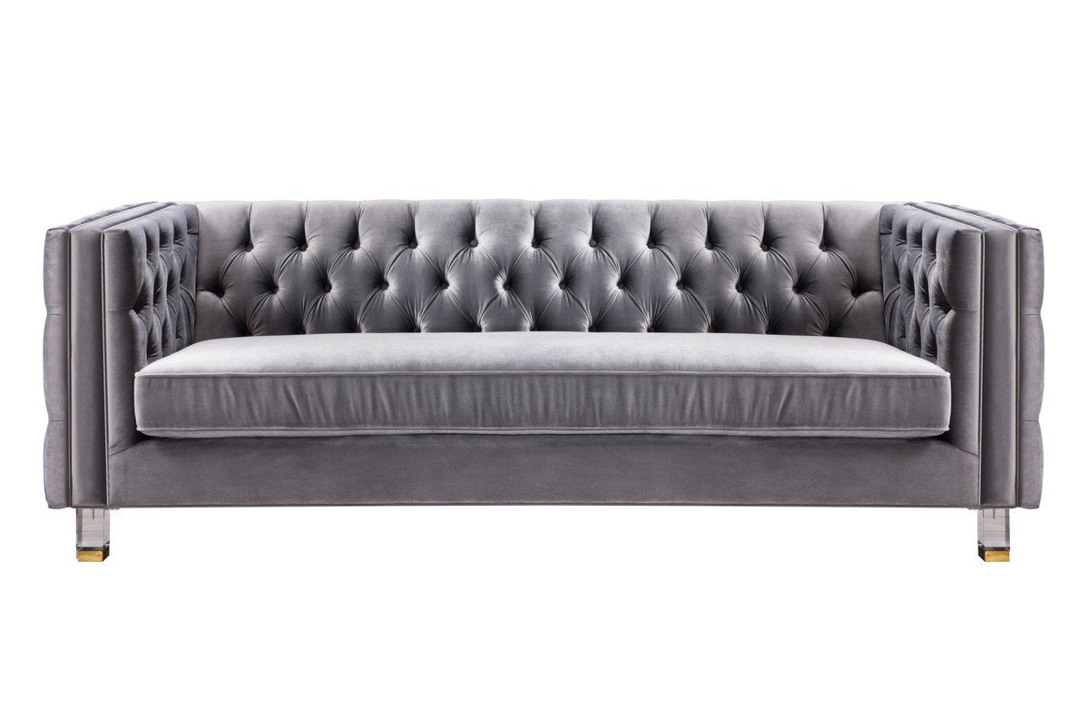 Offering a fresh and contemporary style the Rimini sofa is a work of art that features sumptuous velvet upholstery, elegant button tufts throughout, and lucite legs with steel gold tips. Experience luxury with this durable handmade sofa. Available in green and grey velvet options.