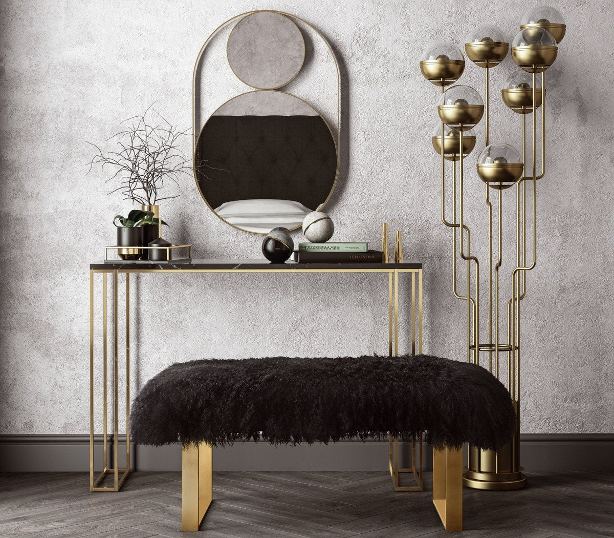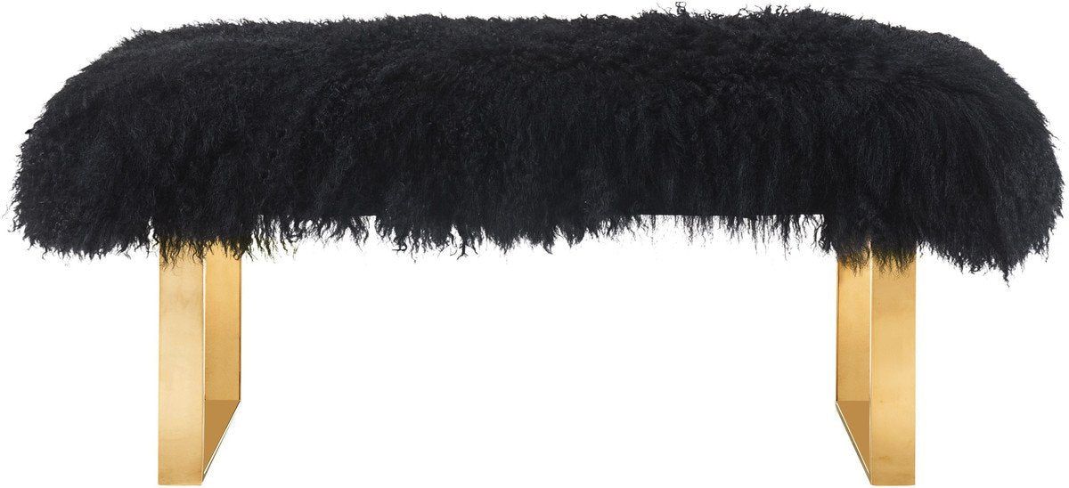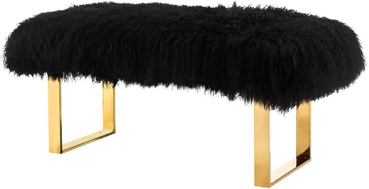 The genuine sumptuous sheepskin fur over the glossy gold stainless steel frame create a harmonized and glamorous look. Create a rich luxe vibe in any space with the stylish and practical Sherpa bench.