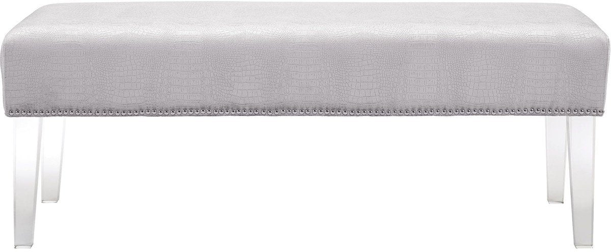 The stylish Stella Acrylic Bench will add a touch of elegance to any space. The comfortable seat features a solid wood frame with a high density foam tufted cushion, while the high quality acrylic legs offer long lasting support and comfort. The hand-applied silver nailhead trim completes the chic look.