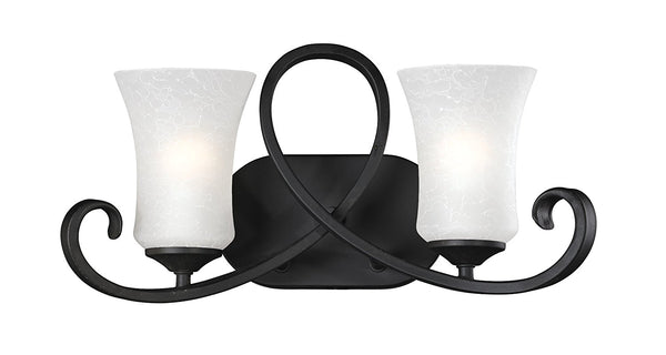 The unique café bronze fixture uses weaving circular designs to create a one of a kind, modern look. White watermark shades compliment this two light vanity, and help to create a totally unique statement in contemporary lighting, perfect for any modern space.