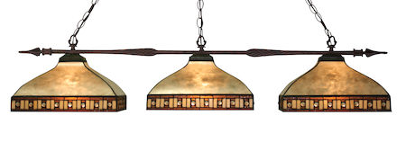 The slim styling of this three light fixture creates a classic yet modern statement. Finished in bronze, this three light fixture uses warm tiffany glass shades to compliment its classic look, and 72’’ of chain per side is included to ensure the perfect hanging height