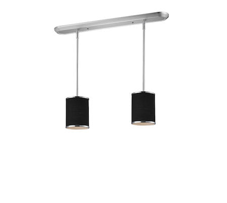 Elegant and contemporary best describe this beautiful two light fixture. Finished in chrome and paired with black shades, this two light fixture would be equally at home in the game room, or anywhere else in the house needing a touch of timeless charm. Adjustable rods are included to ensure the perfect hanging height.