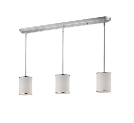Elegant and contemporary best describe this beautiful three light fixture. Finished in chrome and paired with white shades, this three light fixture would be equally at home in the game room, or anywhere else in the house needing a touch of timeless charm. Adjustable rods are included to ensure the perfect hanging height.