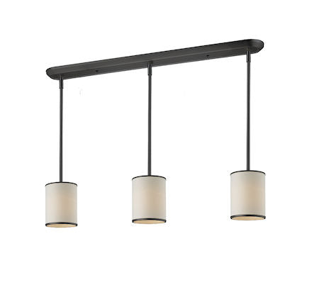 Elegant and contemporary best describe this beautiful three light fixture. Finished in bronze and paired with cream shades, this three light fixture would be equally at home in the game room, or anywhere else in the house needing a touch of timeless charm. Adjustable rods are included to ensure the perfect hanging height.