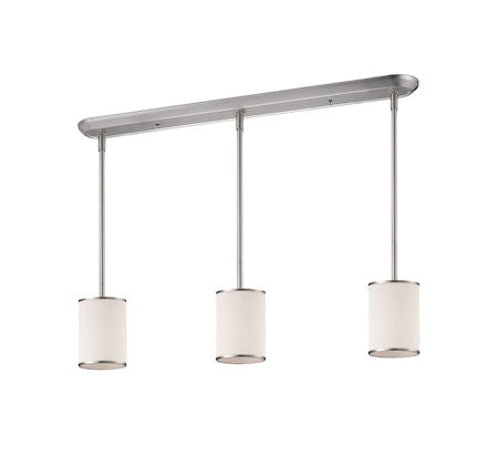 Elegant and contemporary best describe this beautiful three light fixture. Finished in brushed nickel and paired with white shades, this three light fixture would be equally at home in the game room, or anywhere else in the house needing a touch of timeless charm. Adjustable rods are included to ensure the perfect hanging height.