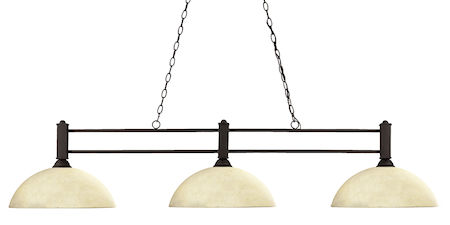 Clean straight line detailing and traditional defines this beautiful three light fixture. Finished in bronze and paired with dome golden mottle shades, this three light fixture would be equally at home in the game room, or anywhere else in the house needing a touch of timeless charm.