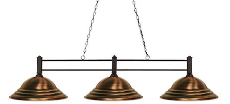 The clean lines of this three light fixture create a simple, yet contemporary statement. Finished in bronze, this three light fixture uses stepped antique copper metal shades to compliment its modern look, and 72’’ of chain per side is included to ensure the perfect hanging height.
