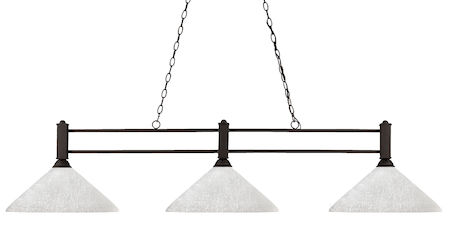 Clean straight line detailing and traditional defines this beautiful three light fixture. Finished in bronze and paired with angle white linen glass shades, this three light fixture would be equally at home in the game room, or anywhere else in the house needing a touch of timeless charm.