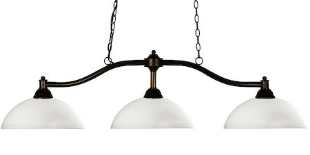 Simple yet versatile detailing defines this beautiful three light fixture. Finished in bronze and paired with dome mottle opal glass shades, this three light fixture would be equally at home in the game room, or anywhere else in the house needing a touch of timeless charm.72 inches of chain per side is included to ensure the perfect hanging height.