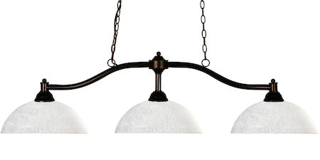 Simple yet versatile detailing defines this beautiful three light fixture. Finished in bronze and paired with dome white linen glass shades, this three light fixture would be equally at home in the game room, or anywhere else in the house needing a touch of timeless charm.72 inches of chain per side is included to ensure the perfect hanging height.