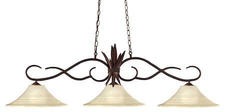 Elegant curved detailing and a bold spike motif define this beautiful three light fixture. Finished in bronze and paired with fluted golden matte shades, this three light fixture would be equally at home in the game room, or anywhere else in the house needing a touch of timeless charm.72 inches of chain per side is included to ensure the perfect hanging height.