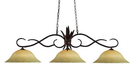 Elegant curved detailing and a bold spike motif define this beautiful three light fixture. Finished in bronze and paired with golden matte shades, this three light fixture would be equally at home in the game room, or anywhere else in the house needing a touch of timeless charm.72 inches of chain per side is included to ensure the perfect hanging height.