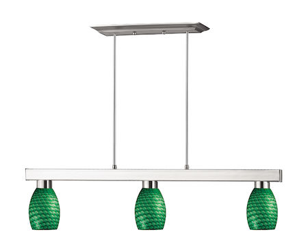Straight line and rectangular detailing defines the bold and contemporary look of this three light fixture. Circular green glass shades provide a splash of color, and telescoping rods ensure a perfect hanging height. This fixture would be the perfect addition to a kitchen, a game room, or anywhere else in the home.