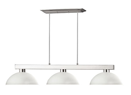 Straight line inspired detailing defines this beautiful three light fixture. Finished in brushed nickel and paired with dome mottle opal glass shades, this three light fixture would be equally at home in the game room, or anywhere else in the house needing a touch of modern charm. Adjustable rods are included to ensure the perfect hanging height.