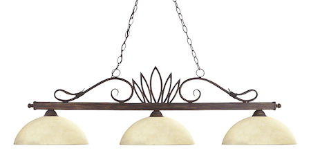 Elegant curved detailing and a crown motif define this beautiful three light fixture. Finished in weathered bronze and paired with dome golden mottle shades, this three light fixture would be equally at home in the game room, or anywhere else in the house needing a touch of timeless charm.