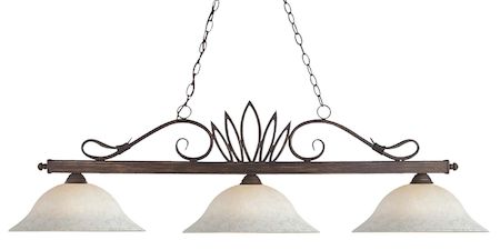 Simple curves and a crown centerpiece define this three light fixture. Finished in weathered bronze, this fixture uses warm glowing white mottle glass shades to create an elegant look. This fixture includes 72’’ of chain on both sides to ensure a perfect hanging height.