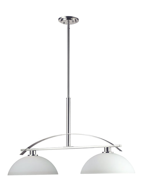 With a stunning chrome arch, this two light fixture is a masterpiece of contemporary design. Matte opal shades hung bottom open create a soft modern glow, while the beautiful chrome detailing makes for a bold and cutting edge statement. Adjustable telescoping rods are included to ensure the perfect height for hanging.