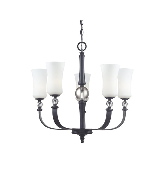 With contrasting white shades and crystal spheres, this five light chandelier is a unique mix of contemporary and traditional styling. Finished in matte black, this fixture creates an elegant yet bold statement.