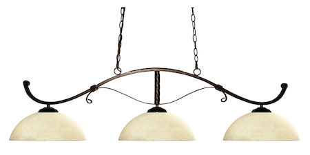 Simple yet versatile detailing and understated curve motifs define this beautiful three light fixture. Finished in bronze and paired with dome golden mottle glass shades, this three light fixture would be equally at home in the game room, or anywhere else in the house needing a touch of timeless charm.72 inches of chain per side is included to ensure the perfect hanging height.